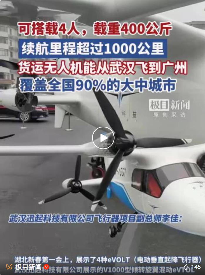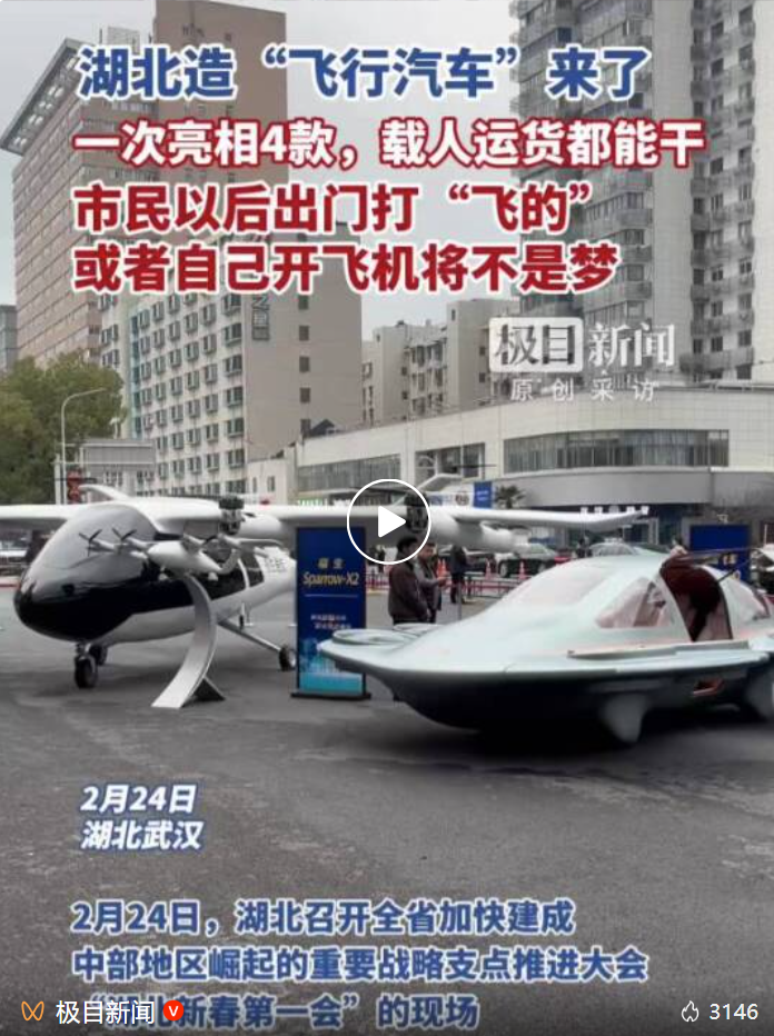 2月24日,春节后上班第一天,湖北召开全省加快建成中部地区崛起的重要战略支点推进大会。“湖北新春第一会”的现场,一口气展示了4种eVTOL,它们也代表了湖北在这条新赛道上的最新成果。