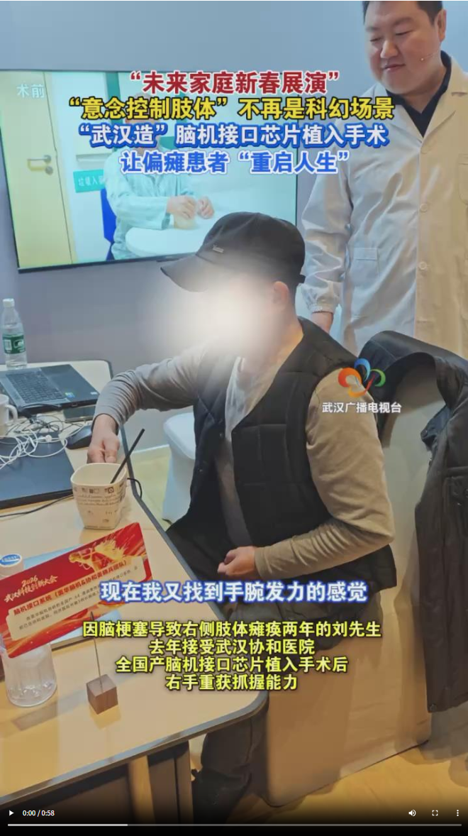 在“未来家庭新春展演”现场,因脑梗瘫痪两年的刘先生,当着众人的面,用“意念”稳稳拿起水杯喝水。植入他脑中的,是武汉衷华脑机研发的全国产“汉芯”脑机接口系统。