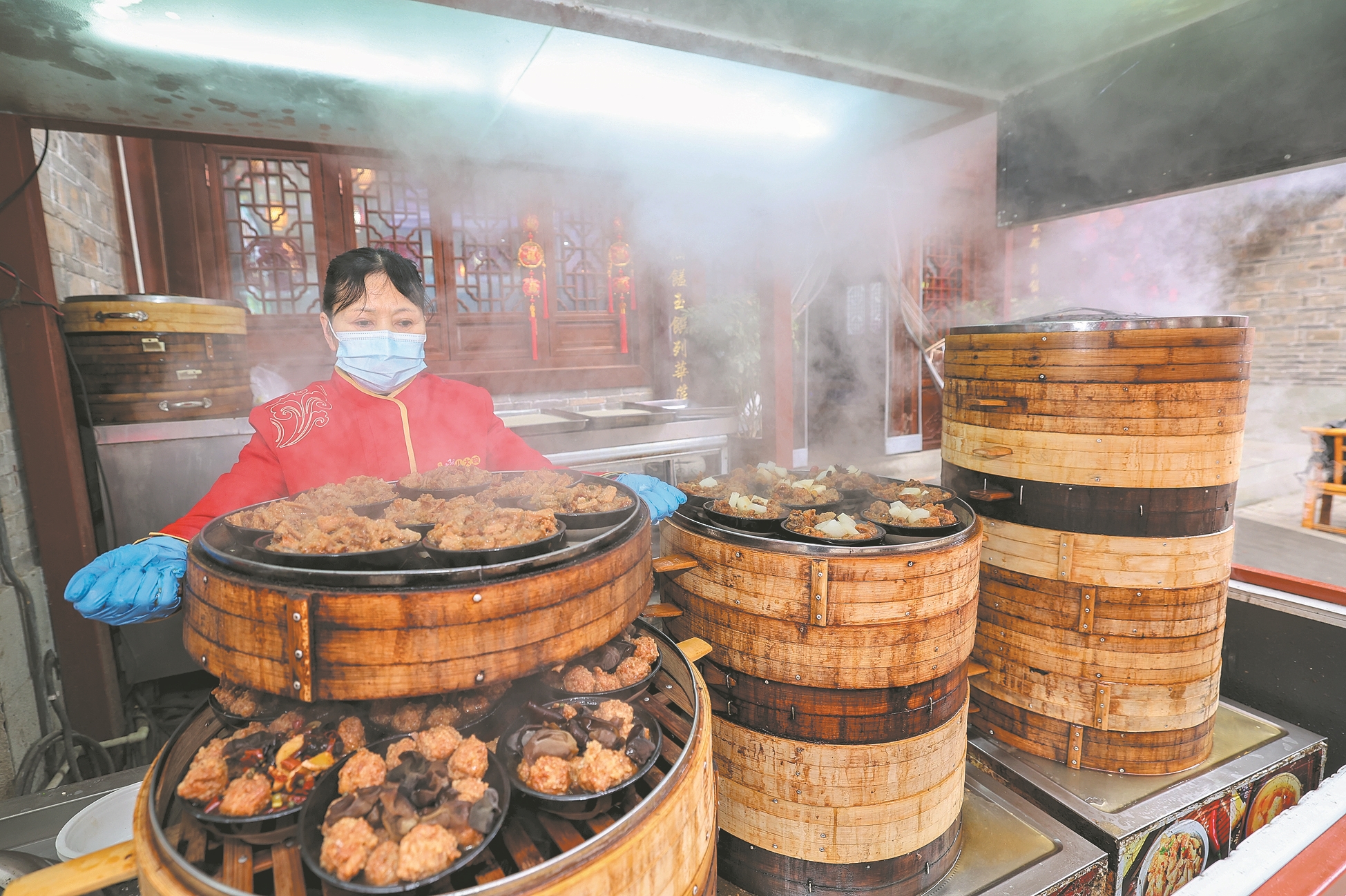 2月18日,在襄城管家巷,商家为顾客准备我市“非遗”美食襄阳八大碗蒸菜。