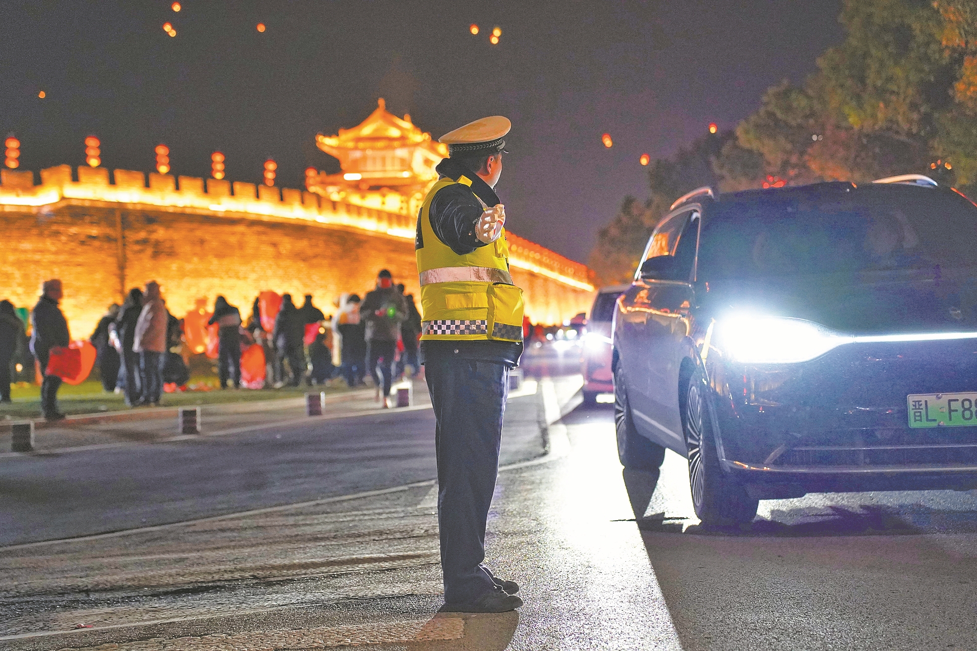 人流中,市公安局交管支队交警一大队大队长朱敏,正带着年轻民警张贯毅值守在古城核心路段。师徒二人并肩疏导交通、服务群众,守护着古城的平安与畅通。