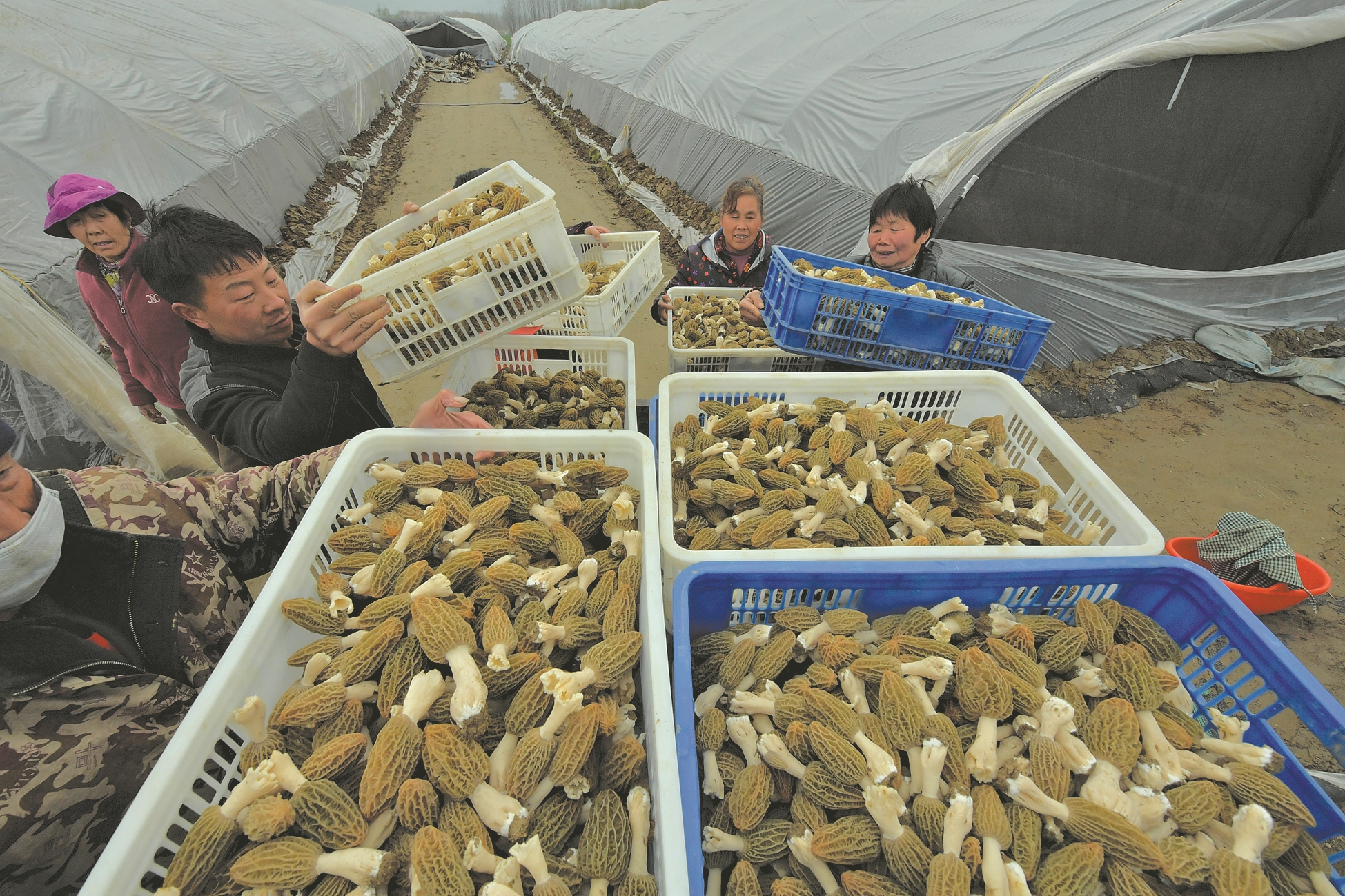 “镇上的农技员常来蹲点,手把手教‘两网三膜’技术;用工缺人,村委会立马帮着对接。”项泽欣说,3月将迎来羊肚菌采摘高峰期,用工量将是前期种植阶段的3倍以上。薛梁村及相邻的袁巷村的羊肚菌种植面积加起来超过5000亩,播种、管护、采收、分拣、烘干等环节,需要大量劳动力,带动附近村民在家门口就业。
