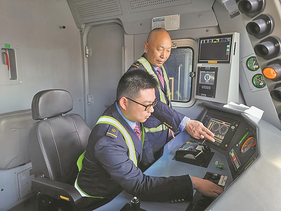 佘汉洲(站立者)和徒弟刘洪亚正核对机车仪表信息。 记者 胡采棣 摄