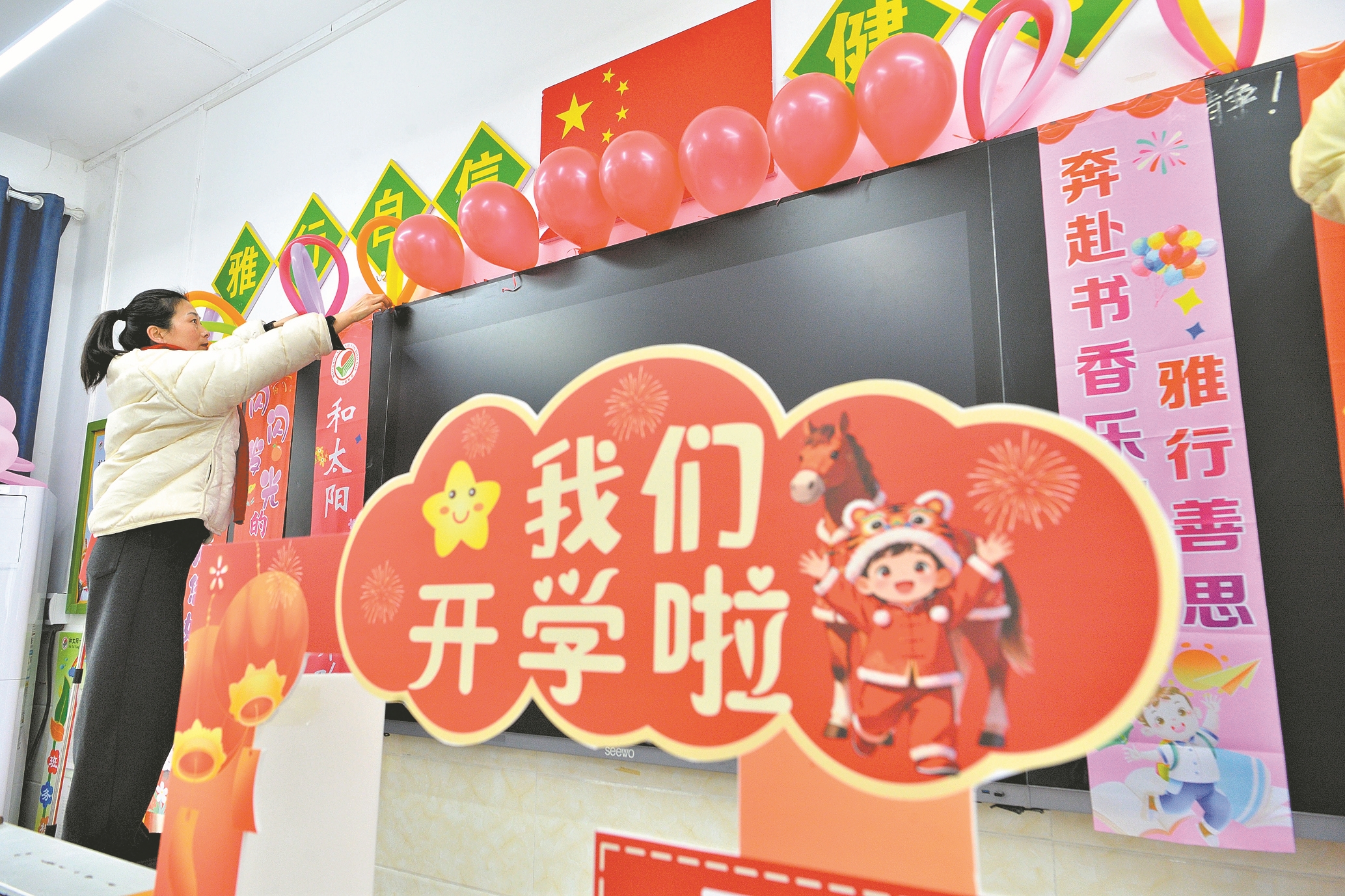 3月2日,保康县实验小学,教师在装饰黑板。开学在即,保康县各中小学精心做好开学前的准备工作,营造安全、舒适、快乐、优美的环境,以崭新的面貌迎接新学期的到来。