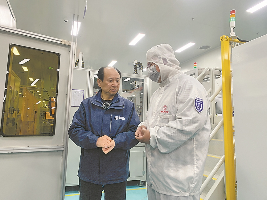 刘长来(左)在骆驼集团新能源低碳产业园的车间里与一线员工交流。 记者 周娜 摄