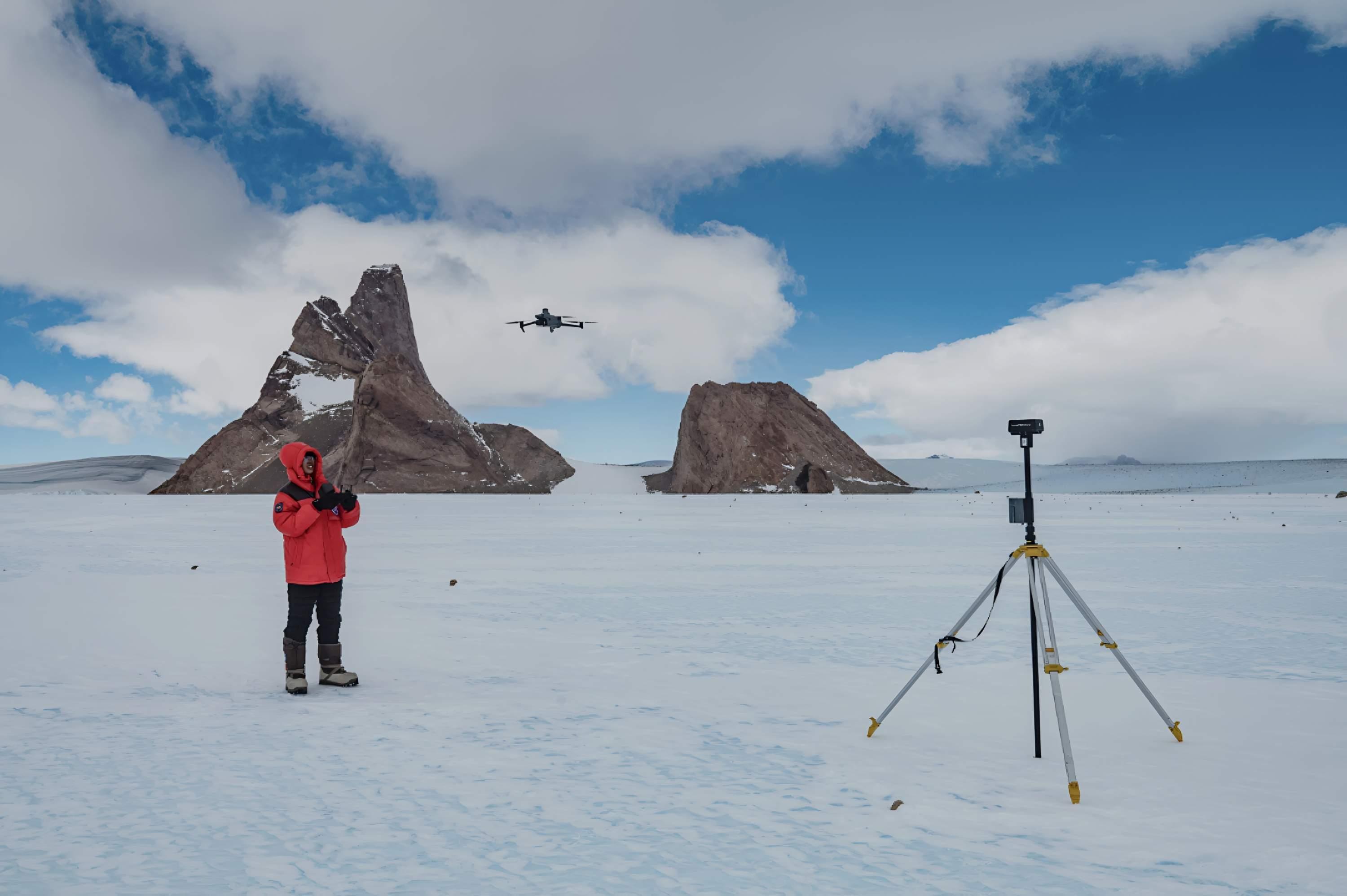 中国第40次南极科学考察队队员、武汉大学中国南极测绘研究中心博士生褚馨德在南极格罗夫山进行无人机航测。 本人供图