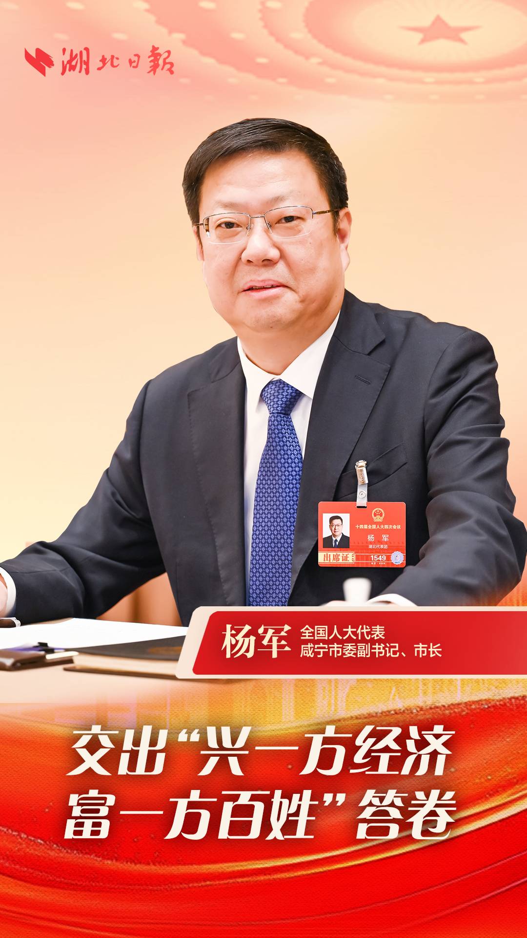 “推动发展必须始终站稳立党为公立场,把为民造福作为最大追求,把科学决策作为基本方法,把真抓实干作为鲜明作风。”3月7日,全国人大代表、咸宁市委副书记、市长杨军接受湖北日报全媒记者采访时说,要以“功成不必在我、功成必定有我”的境界与担当,坚决扛起“兴一方经济、富一方百姓、建一方文明、保一方平安”的政治责任。
