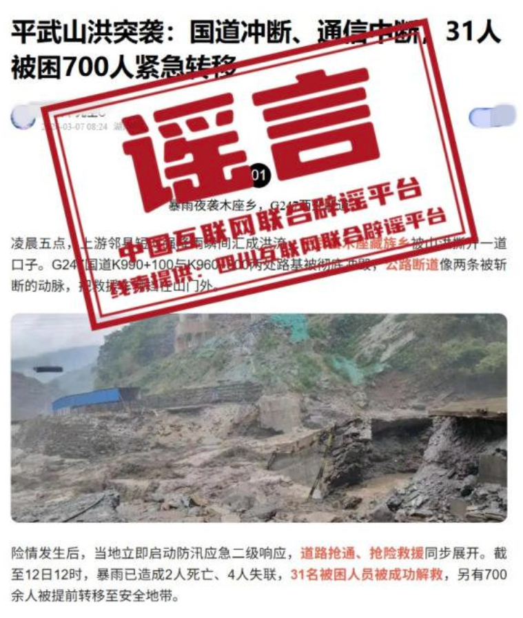 详情:近日,有网民在网络平台发布“平武山洪突袭:国道冲断、通信中断,31人被困700人紧急转移”相关信息,称平武县木座藏族乡发生山洪,G247国道两处路基被冲毁,引发关注。经四川省绵阳市平武县木座藏族乡人民政府核实,近期当地未发生山洪灾害。相关内容实为2022年7月12日木座藏族乡特大山洪灾害的旧闻报道,并非近期发生灾害。发帖人移花接木、断章取义,误导公众。(来源:四川互联网举报辟谣平台)