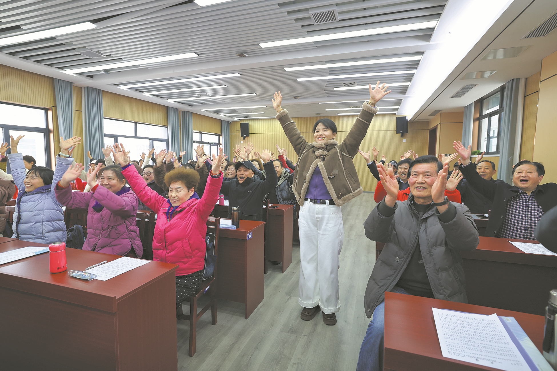 襄阳晚报讯【记者朱月皎 通讯员袁怡 陈琪惠】“Don't believe me just watch……”随着动感的《Uptown Funk》在乐学楼声乐基础2班响起,课堂上“画风突变”——“95后”声乐教师汪爱明带领学员开启了一场别开生面的课间手舞游戏。击掌、拍桌、打响鼓点……随着音乐节奏戛然而止,所有人举起双手,开怀大笑。前一秒还在专注视唱视奏的“老同学”们,此刻卸下了拘谨,笑得像个无忧无虑的孩子。