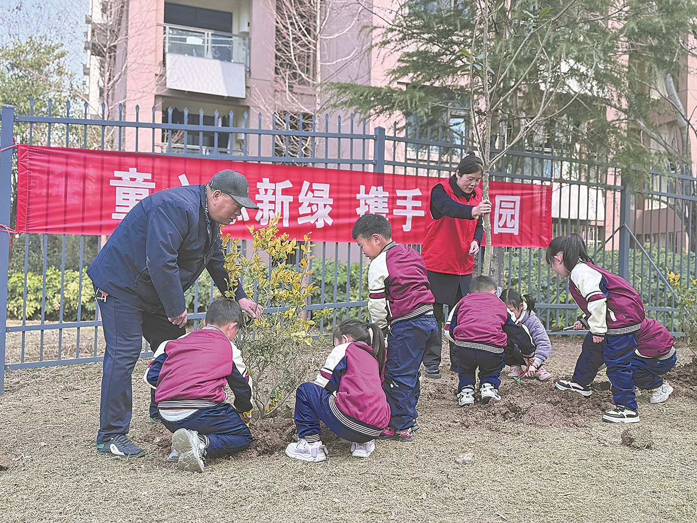 3月11日上午,市住新局第一房管所联合尹集社区、沁德物业、沐恩幼儿园,在尹集紫薇学府公租房小区开展植树节主题活动。图为植树现场。