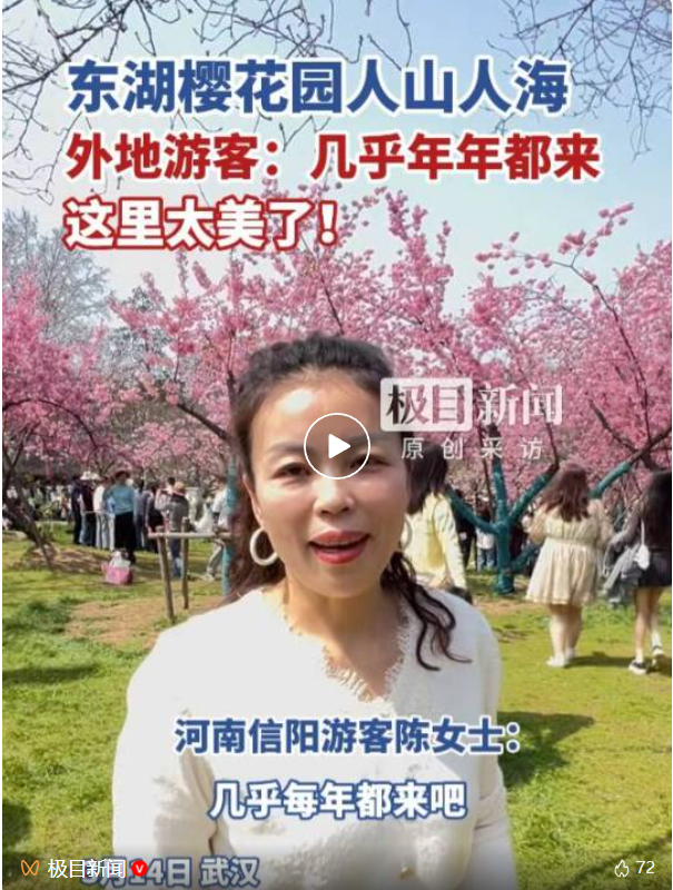 来自河南信阳的游客陈女士,和朋友一起趁着周末来武汉赏樱,被眼前的人潮与樱景深深吸引。“我几乎年年都来东湖樱花园不仅樱花漂亮,这里太美了,虽然人多,但大家都很有秩序,能感受到这份共同的春日欢喜。”她笑着说,自己和朋友已经拍了好多照片,打算好好逛一逛,感受武汉的春日浪漫。