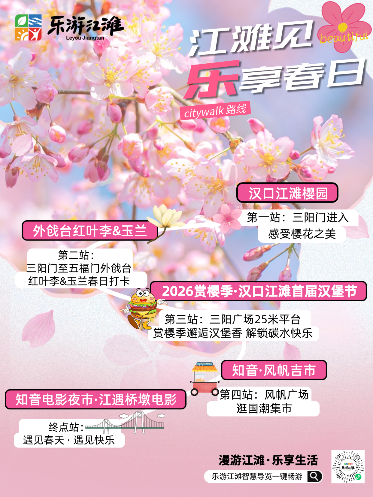 赏花之余,也能品美食、逛市集。首届汉口江滩汉堡节即将开市,美式牛肉堡、芝士拉丝堡等各式美味集聚,堪称“左手樱花,右手汉堡”的江城春日专属体验。在风帆广场的“知音·风帆吉市”,非遗缠花、手作皮具、春日风铃……长桌上摆得满满当当。