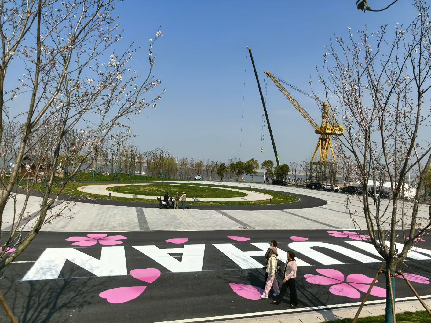 在建设三路闸口,春樱气息扑面而来,十来株樱花树开得正盛。走进终点区域,原本黑色的沥青赛道,化作一条长达760米的绝美“樱花跑道”。路面以艺术手法绘有78组灵动飘逸的樱花与花瓣图案,奔跑其上,如畅游花雨之中,这是今年汉马的独特设计。沿途,60余株真实的樱花树组成樱花长廊,部分已绚烂绽放,与远处工业遗存的大塔吊同框,形成刚柔并济的独特美感。“变化太大了,真漂亮!”3月13日上午,家住附近的万先生特意来“探班”,他举着手机拍个不停,“氛围十足!到时候选手跑过终点线,仪式感拉满!”在他的镜头下,有市民坐在大朵樱花图案上拍照,有市民正在樱花树下漫步。