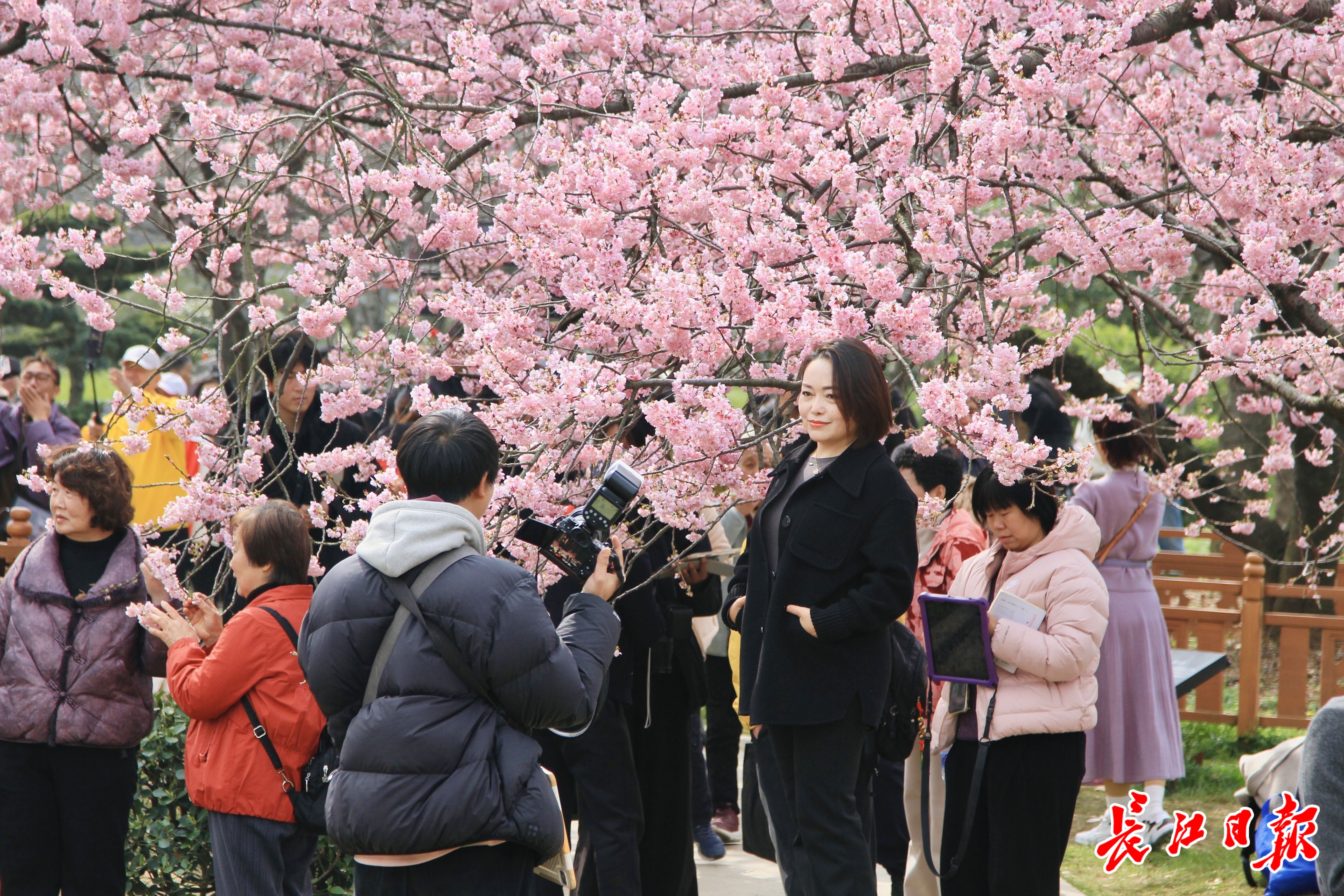 知音文化旅游区是今年崛起的赏樱“新贵”。记者从龟山南路长江大桥汉阳桥头的入口处登上龟山,蝴蝶泉、知音殿等观景平台视野极佳。脚下,长江与汉水交汇,长江大桥如长虹卧波,对岸的黄鹤楼在阳光下泛着金光。山间的樱花栈道旁,早樱开得正欢,人流如织,再过几天中樱即将接力登场。