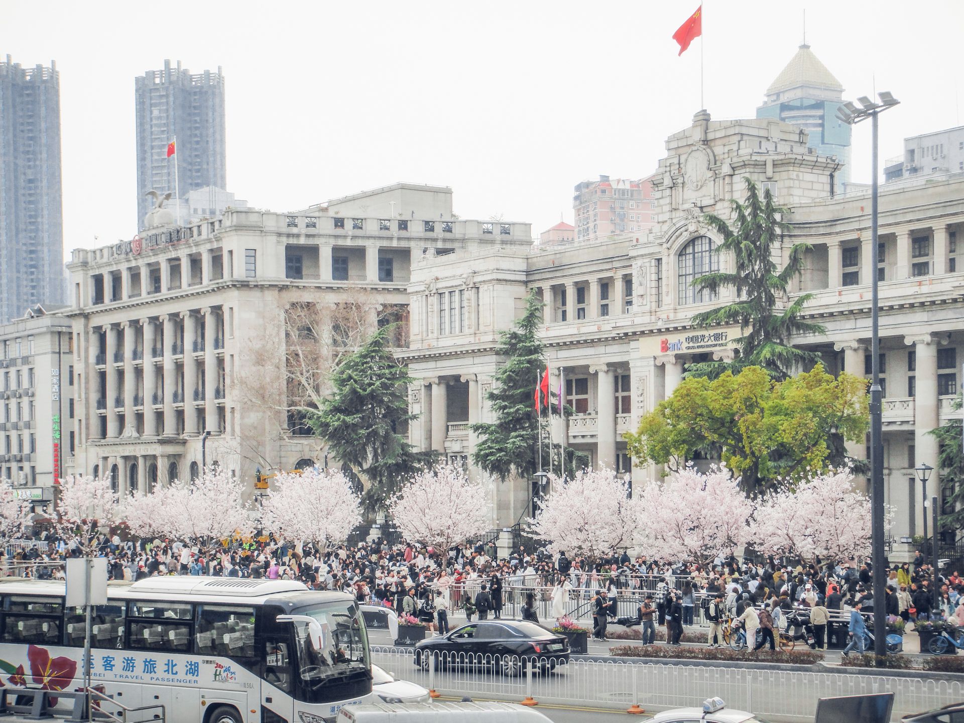 武汉关广场2025年樱花盛开引来游人如织。 (资料图片)