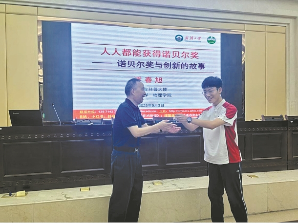 武汉大学潘春旭教授来校做讲座,向“楚才计划”实验班学生赠送钢笔。