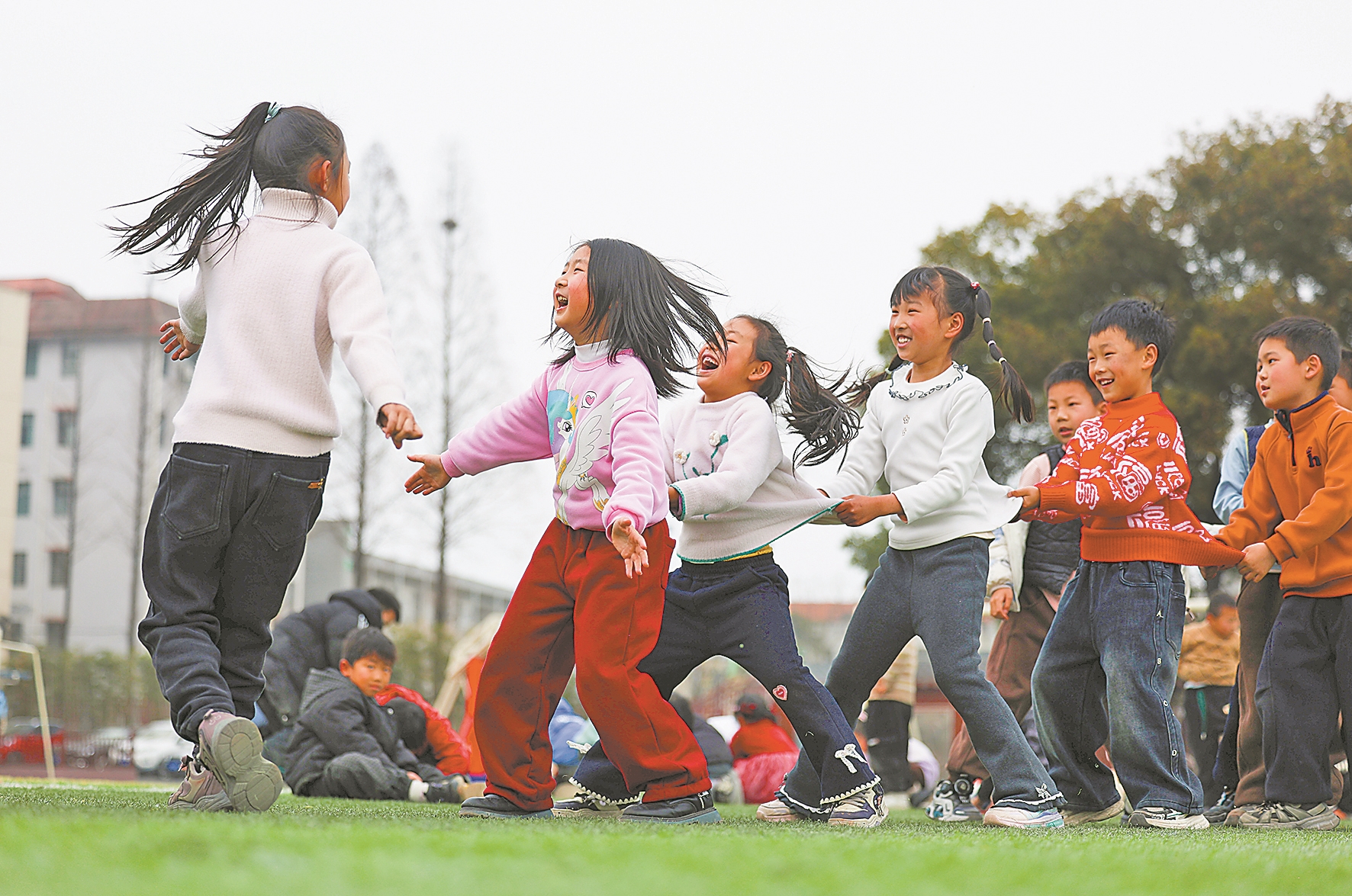 近日,樊城区竹条中心小学的学生们在操场上开展老鹰捉小鸡、跳绳、踢足球等体育活动,乐享大课间欢乐时光。