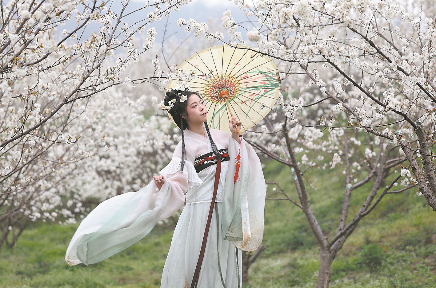 3月14日,身穿汉服的游客在襄城区隆中街道办事处陈家寨樱桃沟游玩、赏花。近期,隆中街道办事处山野间的樱桃花盛开,不少汉服爱好者相约到此踏青、赏花,展示汉服之美。