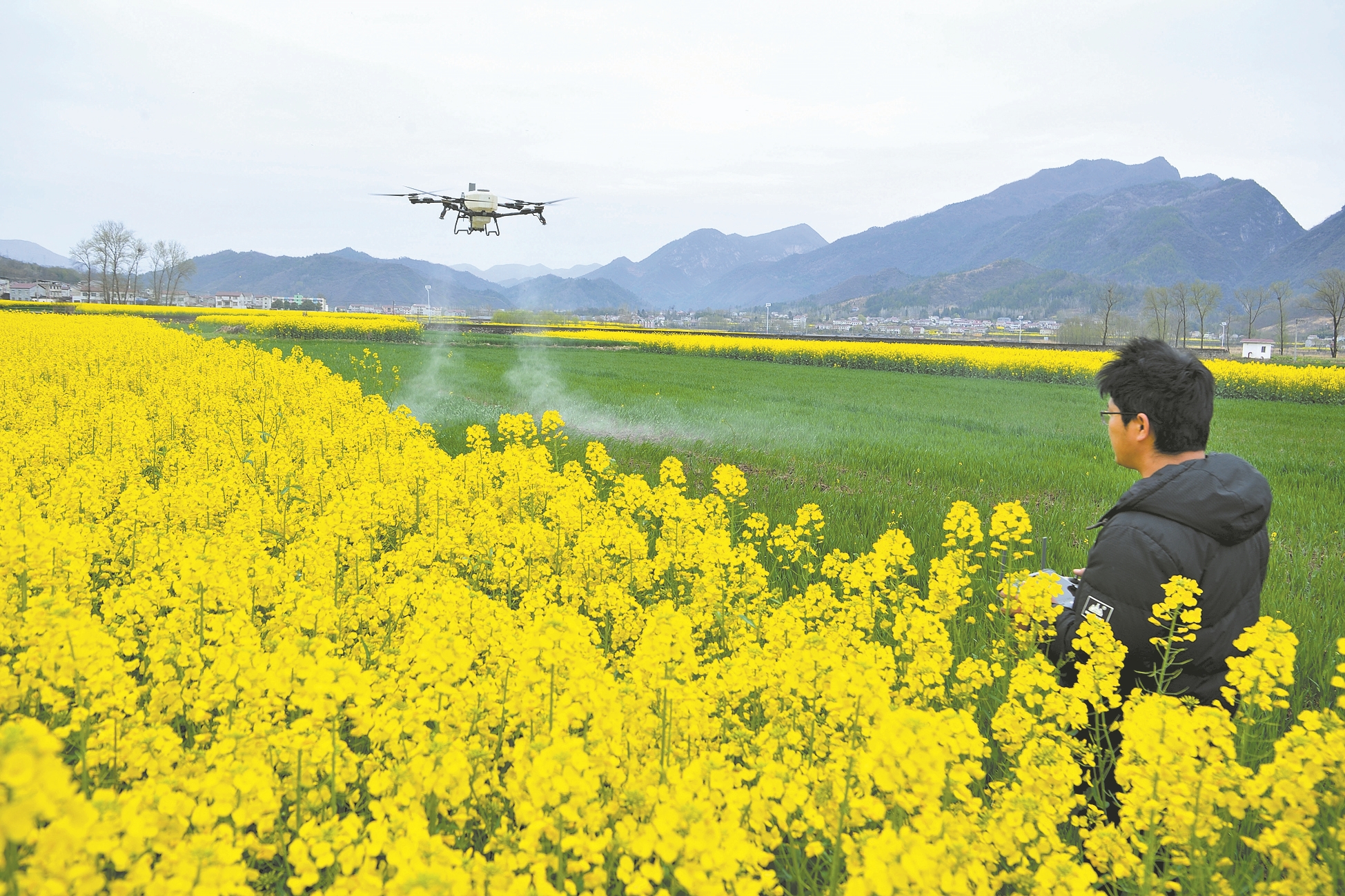 3月18日,在保康县马良镇潮水村,农技人员操作植保无人机对小麦开展飞防作业。