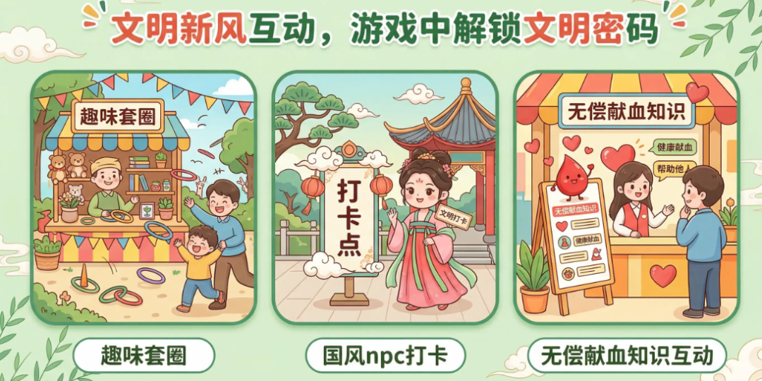 “讲文明 树新风”趣味套圈,移风易俗、绿色环保等文明理念藏进道具,套中就有文创小礼品;国风主题移风易俗打卡区,萌娃志愿者、国风 NPC 陪你拍照打卡;垃圾分类科普、禁毒反诈宣传、无偿献血知识互动,还有“为你读书”助残阅读项目暖心展示,在欢乐中践行文明新风。