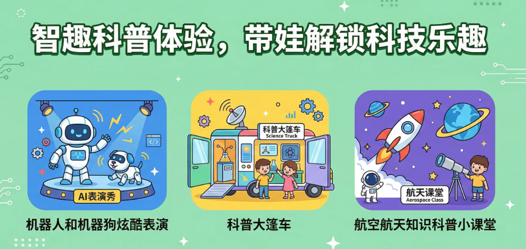 机器人、机器狗炫酷表演,科普大篷车趣味互动,航空航天知识科普小课堂;还有交通安全知识大转盘有奖问答,“一盔一带”、车辆盲区实景讲解,边玩边学,给孩子满满科技感体验。