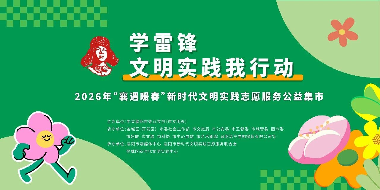 汉江网讯(记者 陈玉荣 金成岑)春风送暖,雷锋精神伴春来~由中共襄阳市委宣传部(市文明办)主办,各城区(开发区)、市委社会工作部、市文旅局、市公安局、市卫健委、市城管委、团市委、市妇联、市文联、市科协、市中心血站、市艺术剧院、襄阳苏宁易购销售有限公司等协办,襄阳市融媒体中心、襄阳市新时代文明实践志愿服务联合会、樊城区新时代文明实践中心承办的学雷锋 文明实践我行动 2026年“襄遇暖春”新时代文明实践志愿服务公益集市终于要和大家见面啦!