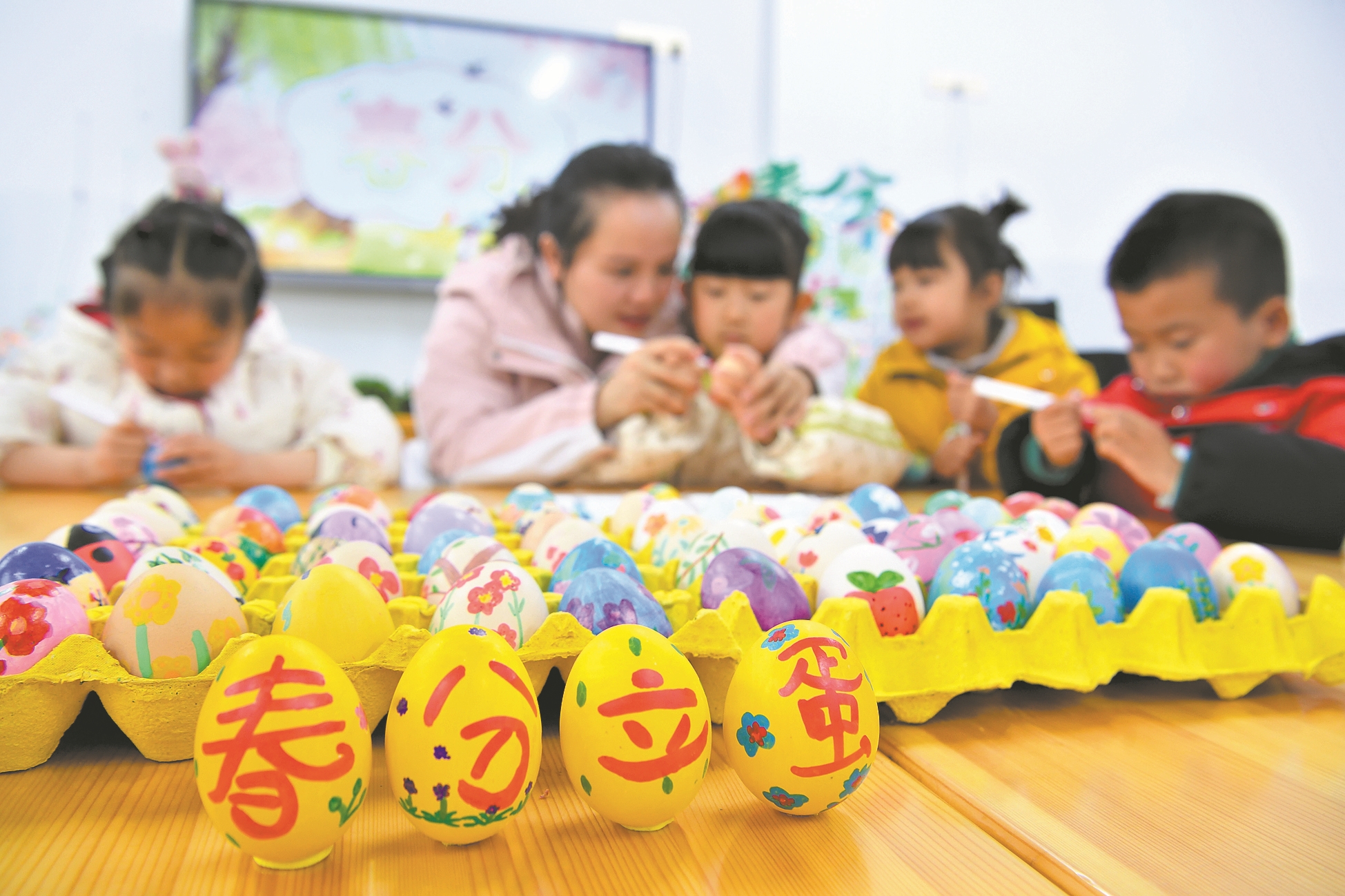 3月19日,在保康县县直机关第二幼儿园,老师指导小朋友们绘制彩蛋。