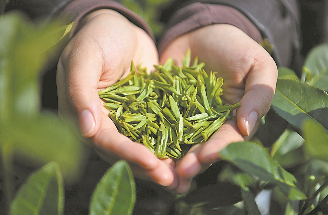 茶农展示采摘的春茶。