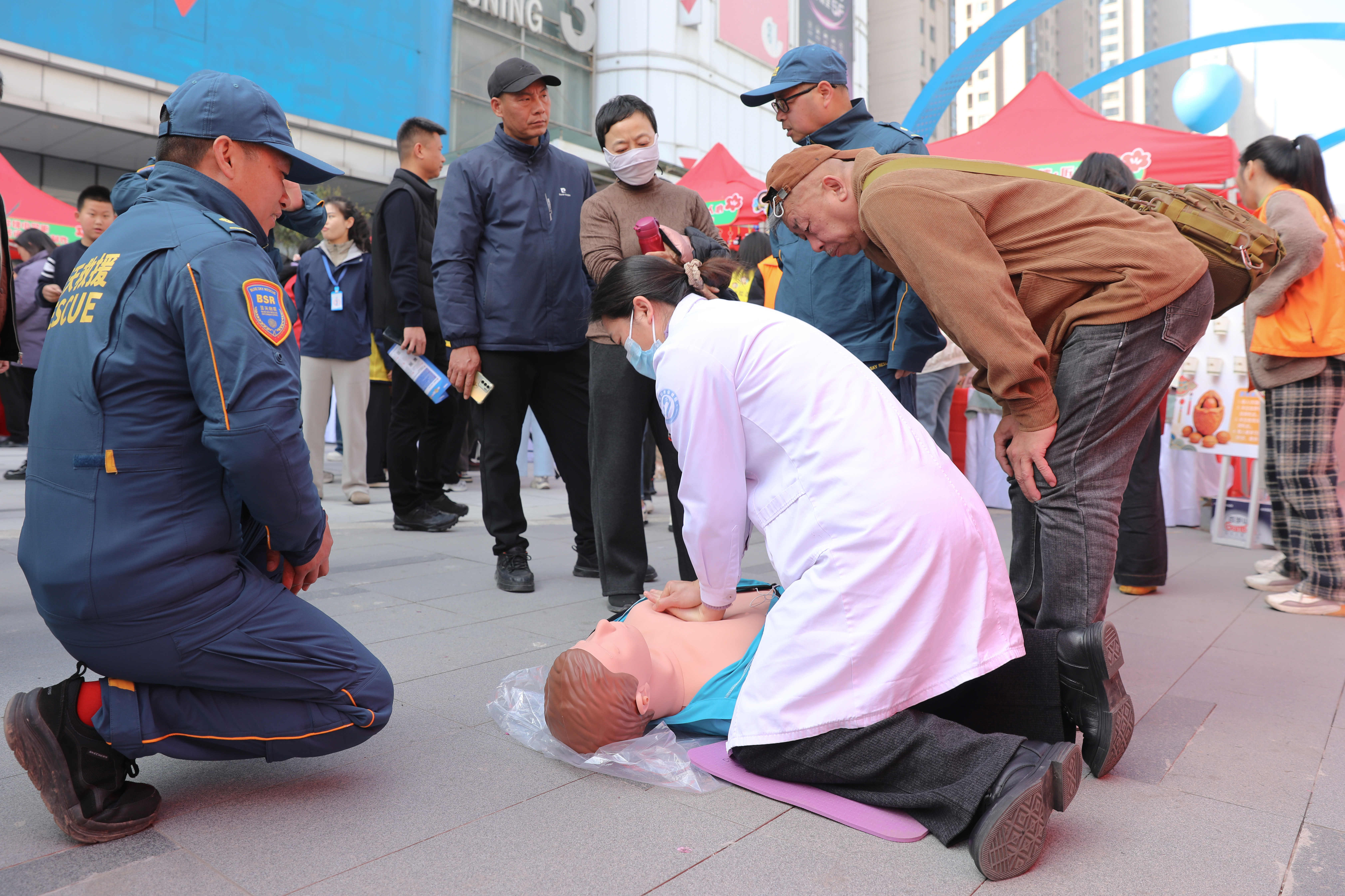 在“襄当行”志愿服务品牌摊位前,蓝天救援队“第一响应人”、绿马甲环保公益服务中心“汉江守护侠”进行品牌展示和项目互动,为群众提供应急救援技能教学和公益环保知识科普。