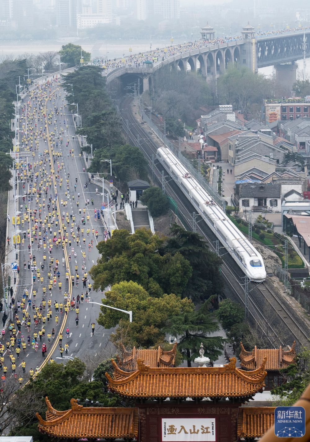 ↑ 参赛选手经过黄鹤楼。新华社记者 伍志尊 摄