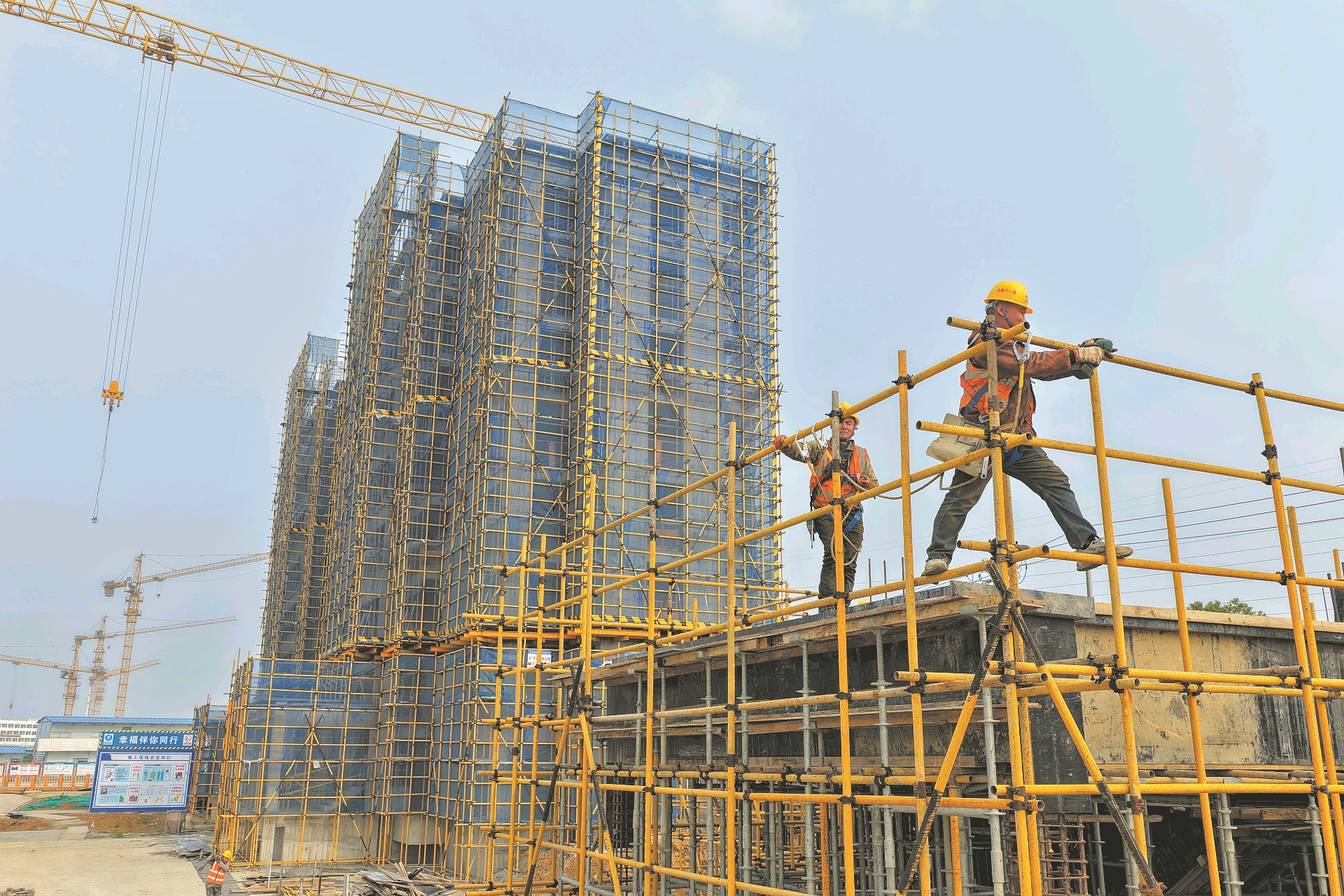近日,中铁十一局施工人员在襄州区双沟蓝领公寓建设项目进行公寓楼主体结构施工。