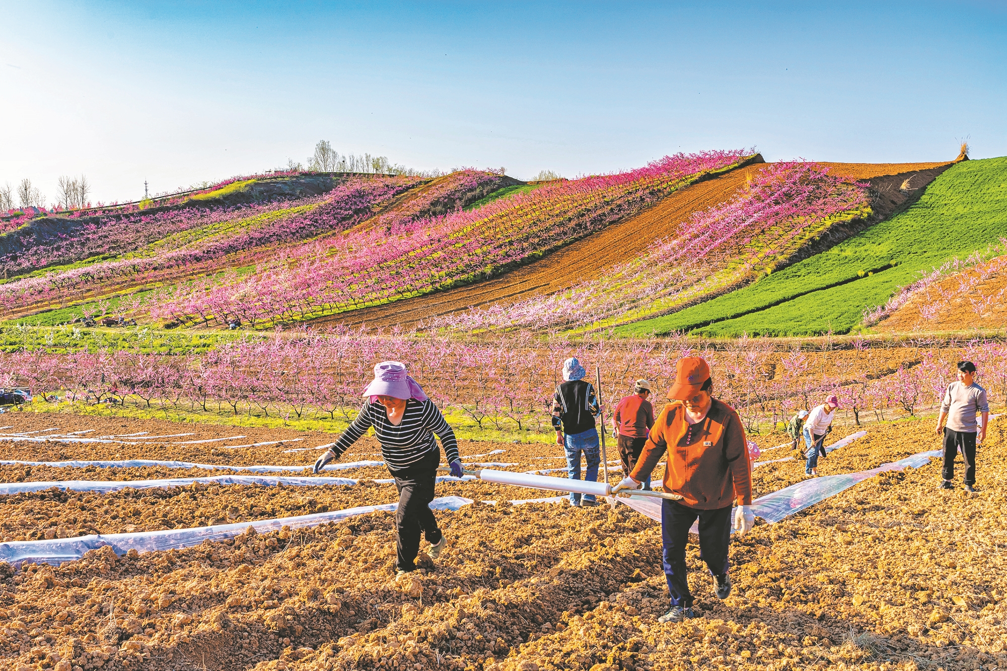 田间,村民们正协作铺设地膜,身影在花海与沃野间忙碌穿梭。