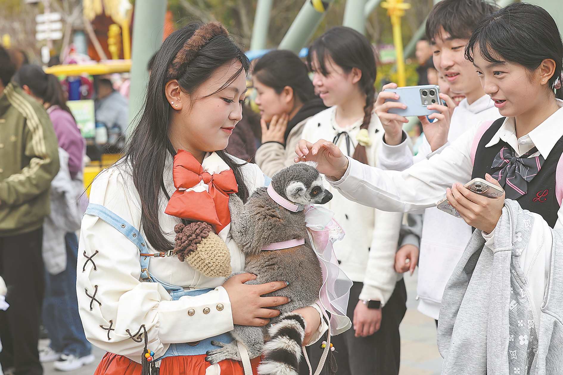 3月21日,游客在襄阳华侨城奇幻度假区奇幻谷与环尾狐猴互动。