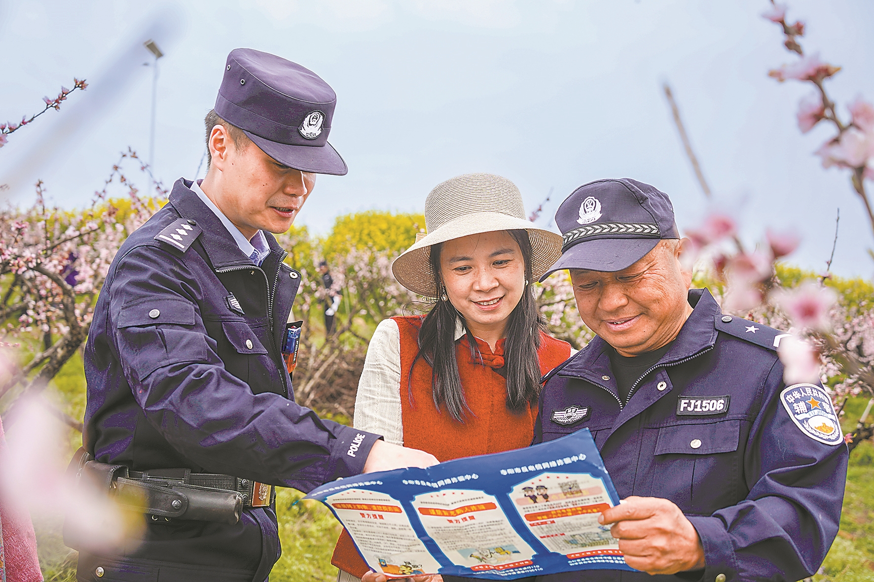 3月21日,熊集镇“桃花节”文旅盛宴启幕,千亩桃林竞相绽放,吸引游客纷至沓来。枣阳市公安局熊集派出所创新构建“花下守平安、花间优服务、花乡护农兴”的“一花三护”工作法,将警务触角延伸至田间地头,以精准警务护航文旅融合,让“赏花经济”绽放平安底色。图中民警向游客普及反诈防骗、踏青安全等知识。