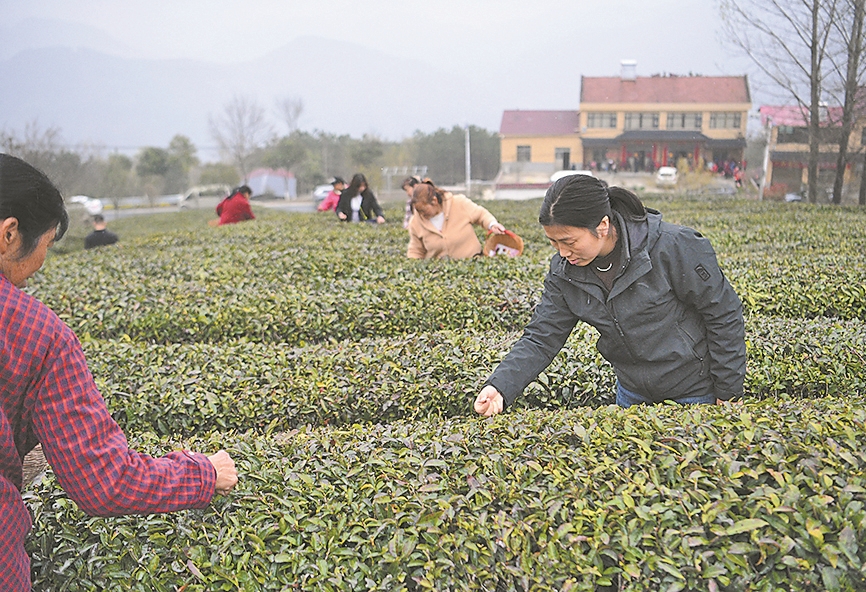 3月26日,在保康县马良镇溪峪村茶园,茶农在采摘“明前茶”。清明节临近,保康县20万亩茶园陆续进入“明前茶”采摘期,该县各地茶农茶企抢抓时节采摘、加工“明前茶”,供应市场。