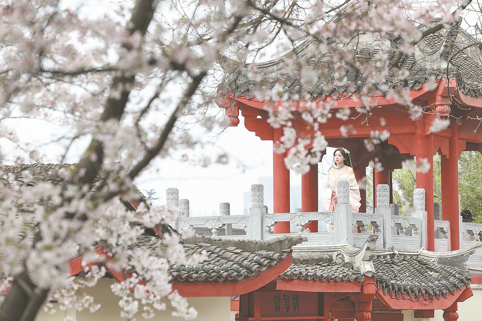 3月24日,襄阳古城护城河畔阳春门公园里的樱花绽放,吸引众多游客前来游玩、赏花。