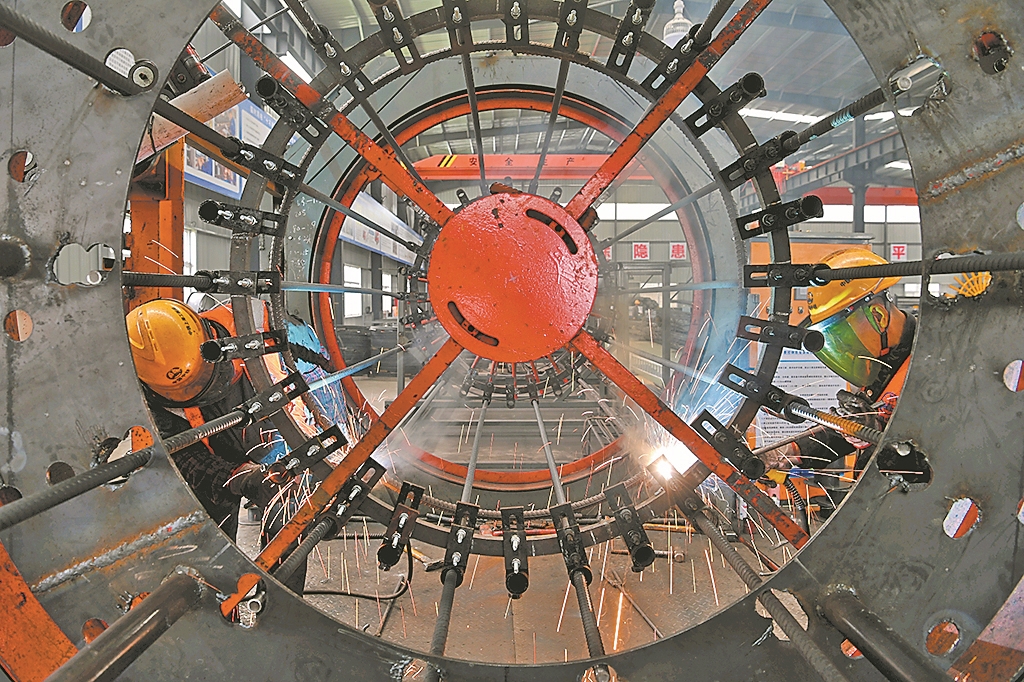 3月25日,在中铁上海工程局襄新高速公路项目综合场站,工人正在焊接钢筋笼。