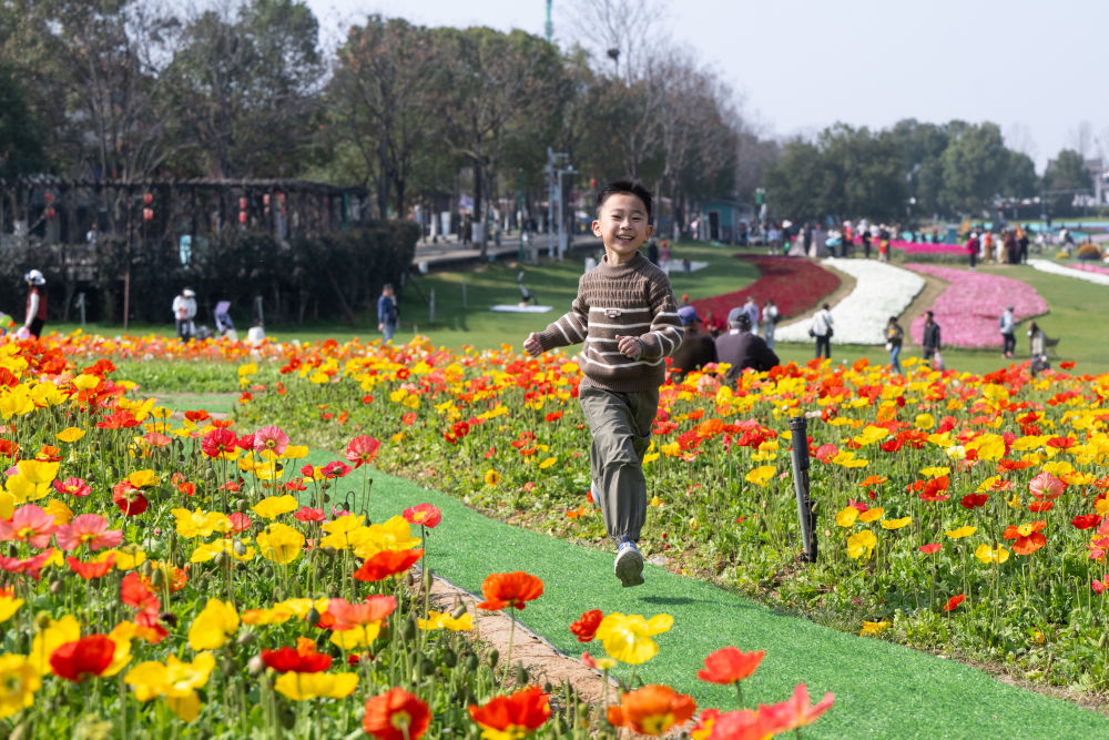 小朋友在武汉花博汇赏花玩耍。新华社记者 肖艺九 摄