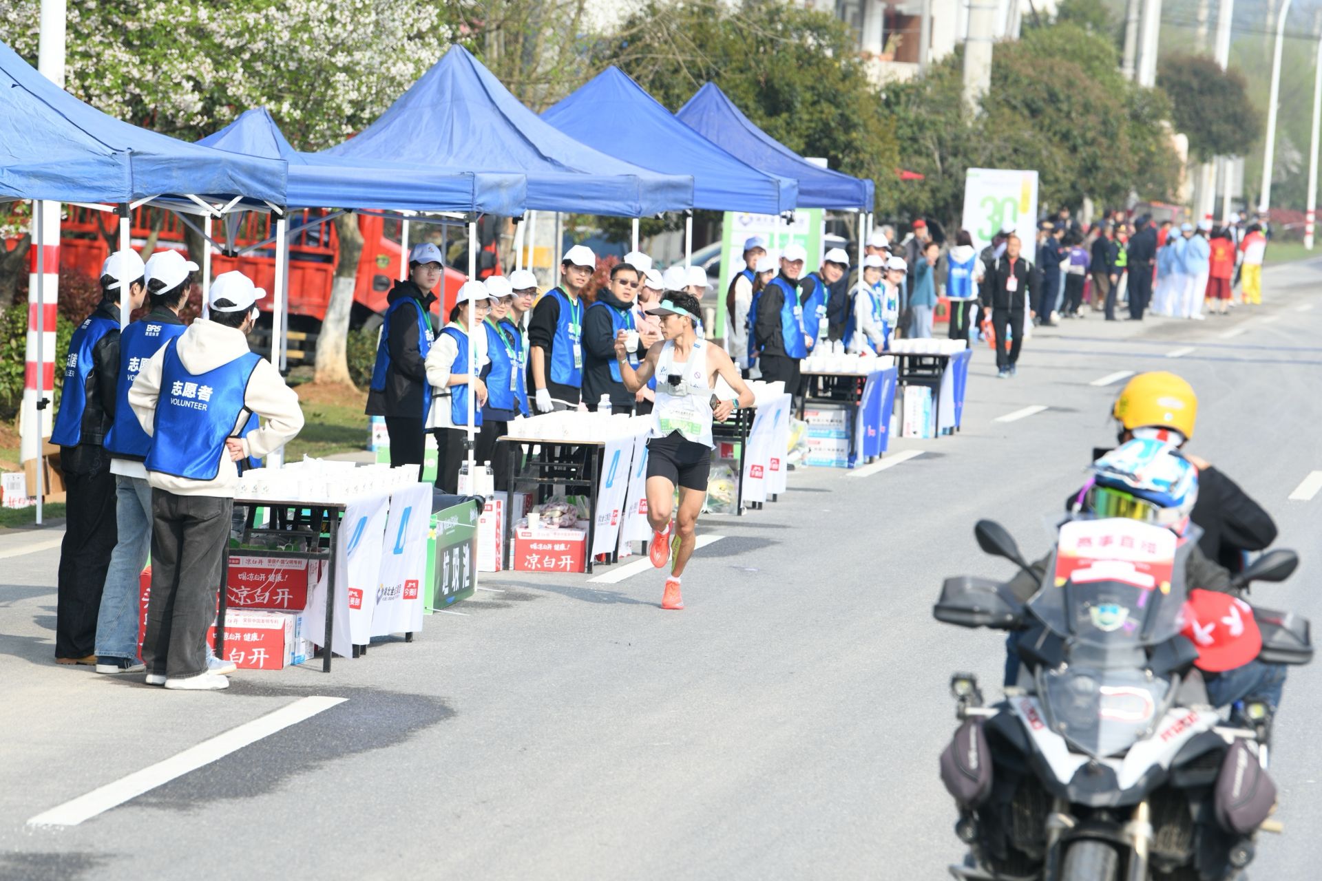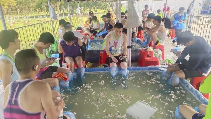 “喝口水吧!”“我帮您做一下拉伸”在补给站、在赛道沿线、起终点,2300名身着统一服装的志愿者在岗位上默默忙碌,湿透衣衫,笑容却始终相随。