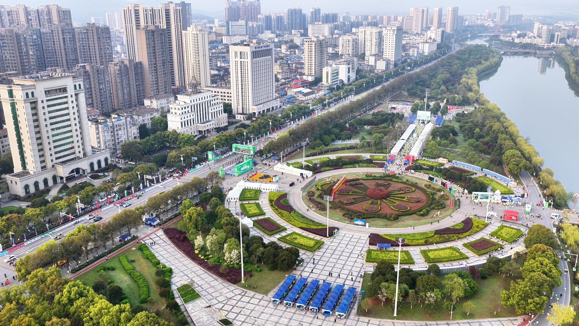 淦河如镜,潜山苍翠,一路繁花相伴,赛道串联多个城市公园,选手如同奔跑在山水画卷之中。