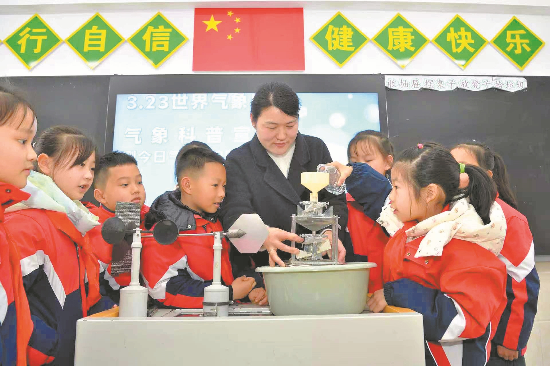 近日,在县实验小学,县气象局工作人员指导学生体验操作翻斗式雨量传感器。该校通过开展气象科普主题活动,让孩子们在生动有趣的互动体验中观察气象、探索自然,感受科学魅力。