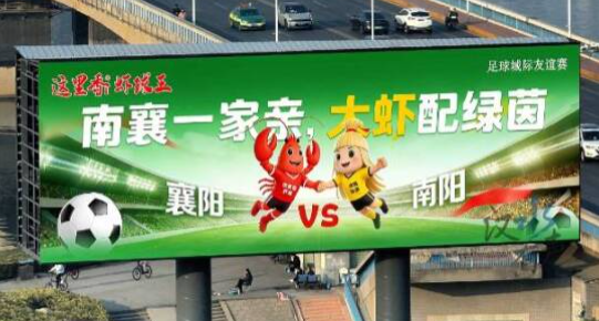 在襄阳南阳城际足球友谊赛前夕,襄阳的网红大屏滚动播放“襄南一家亲大虾配绿茵”“兄弟来相见大虾遇烩面”等暖心标语,提前营造浓厚赛事氛围,让双城情谊深入人心,也为赛事经济的升温埋下伏笔。