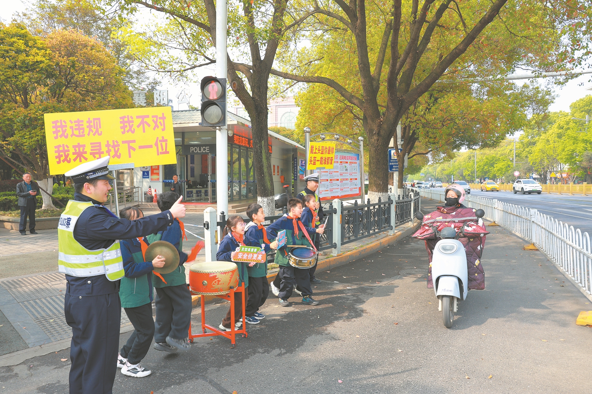 对未按规定佩戴安全头盔的驾驶人,孩子们丝毫没有怯场,主动上前喊话:“叔叔停一停,您的头盔在哪里?”童趣十足的劝导语,让不少未佩戴头盔的市民面露笑意,纷纷停下车辆,主动拿出头盔规范佩戴。