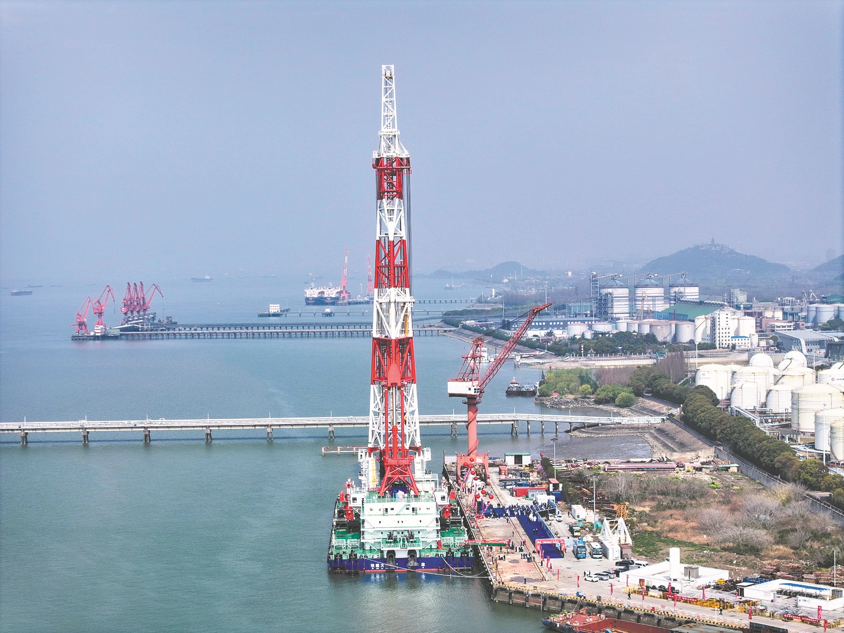 3月31日在江苏南通拍摄的156米动力定位打桩船“铁建大桥桩1”号(无人机照片)。