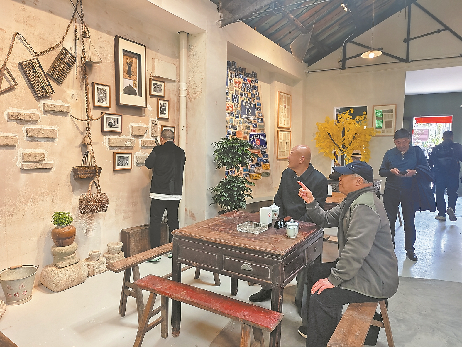 市民游客坐在茶馆看着老物件回忆往事。 记者 张亚婷 摄