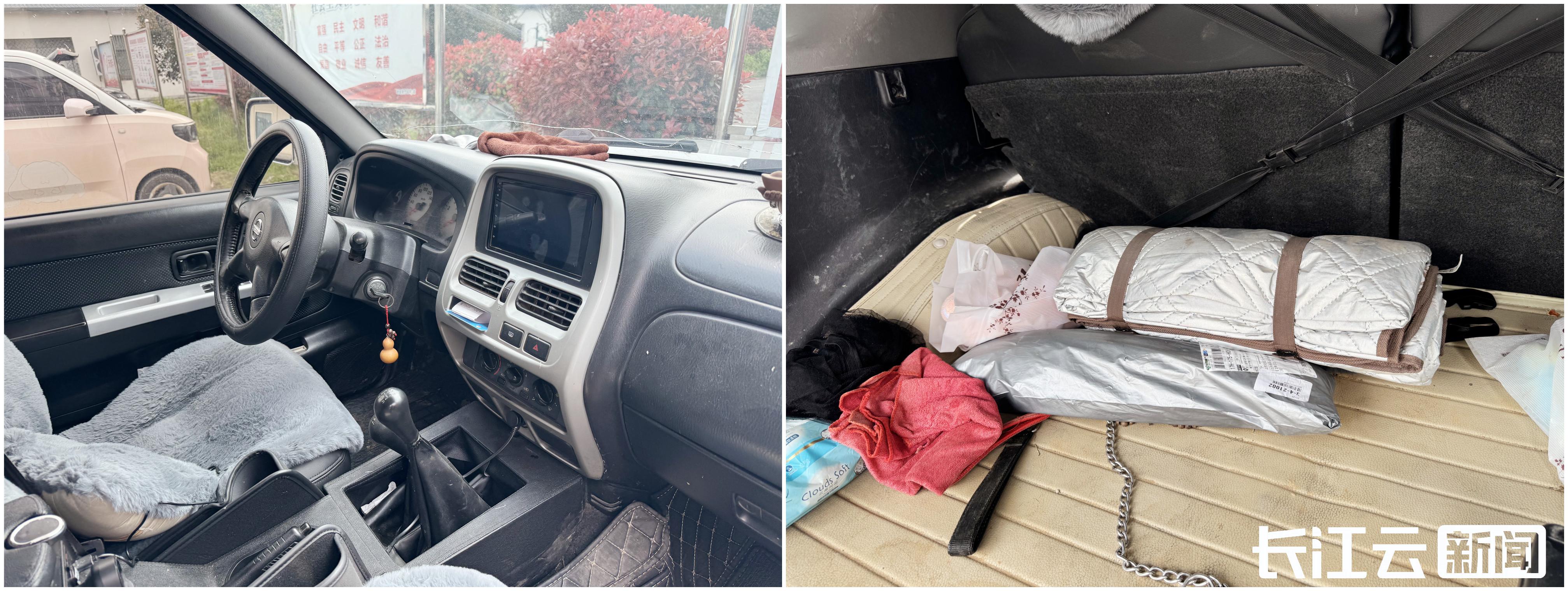 记者在村部里仔细看着吴劲松那辆车,车座位很破旧,后排的座位上有一个生锈的电饭煲内胆,一个大功率的手电筒。妻子朱莉告诉记者,这个电饭煲内胆,是吴劲松平时用来装剩饭喂流浪狗的,而车后备厢,至今还放着当时防汛时垫着睡觉的防潮地垫。每逢汛期,这辆车就成了吴劲松的临时住所,吃住都在车上。