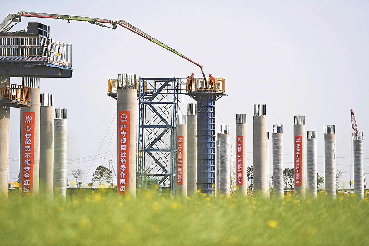 4月5日,中铁上海工程局施工人员在襄新高速公路项目作业。