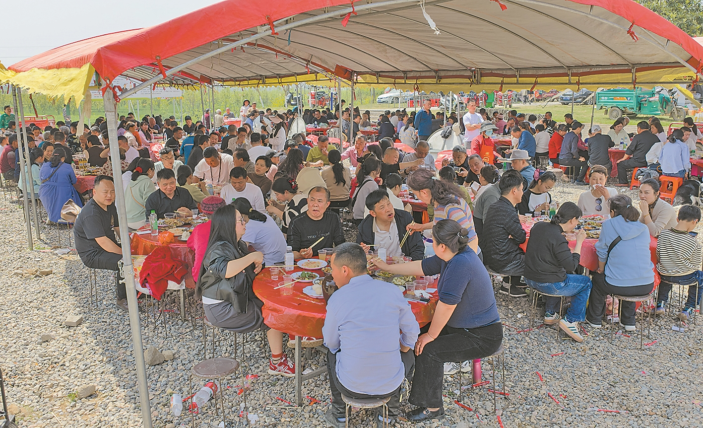 4月5日,游客在参加千人宴。4月4日,为期3天的襄州区朱集镇下湾村第二届梨花文化艺术节开幕。村民们垒起土灶、架起蒸笼,烹制特色蒸菜。千余名游客围坐共享乡村盛宴。以花为媒,以食为桥,这场烟火气十足的活动,既展现了乡村民俗魅力,也为农文旅融合、助农增收注入新活力。