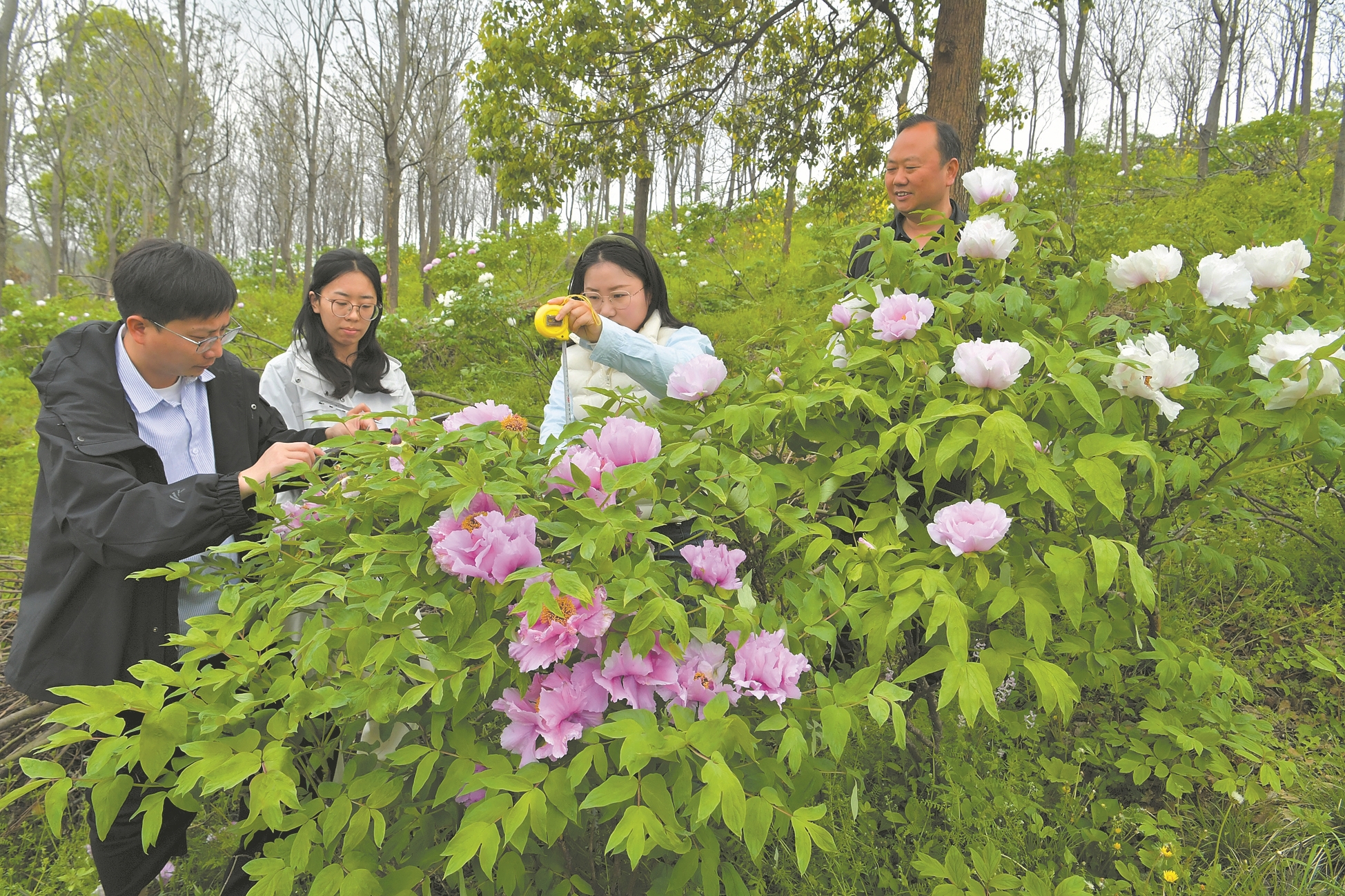 4月2日,在市林业科研所牡丹培育基地,科研人员在对培育的牡丹品种进行监测、选育。