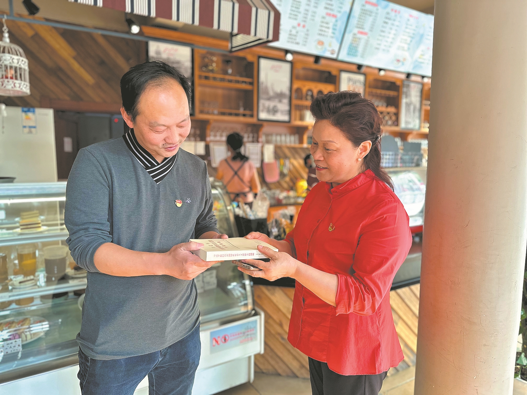 北街商圈综合党委工作人员向商户赠送理论书籍。