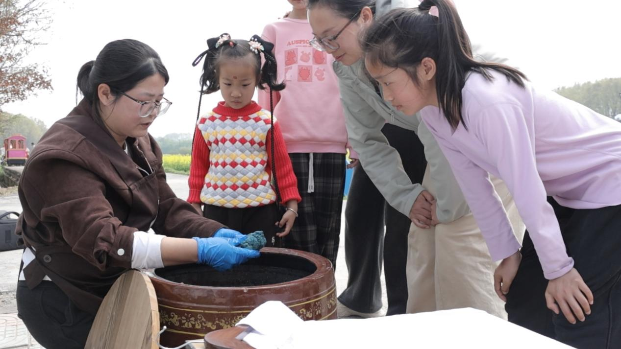 李家染坊村以“染”闻名。“把白布打湿,扎成想要的花型,放到染缸里浸染,染料是板蓝根熬的,加黄酒发酵,染出来就是天然的蓝……”3月28日上午,李家染坊村染布体验馆负责人朱雪琴一边搅动染缸,一边向围观的游客讲解。
